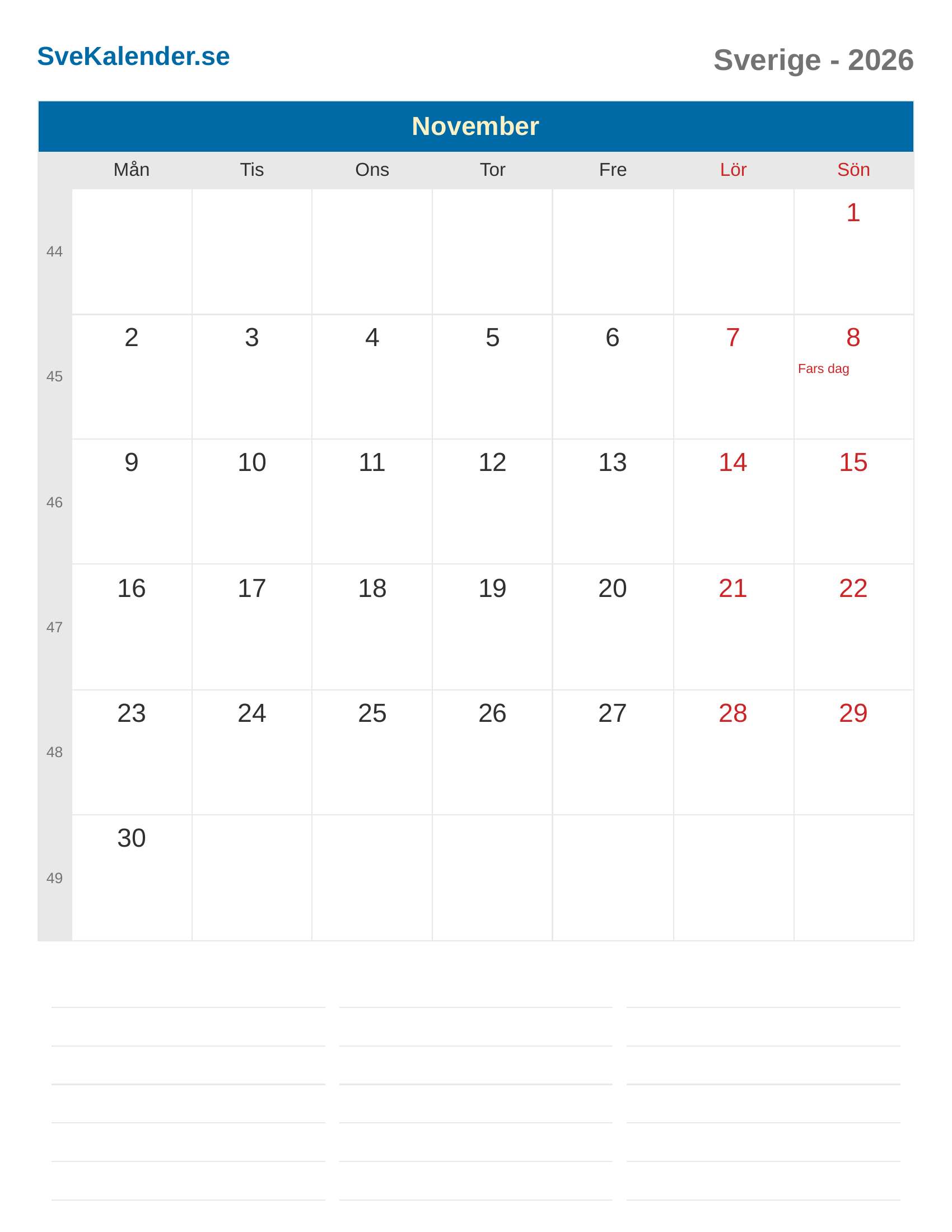 Kalender 2026 Sverige - November