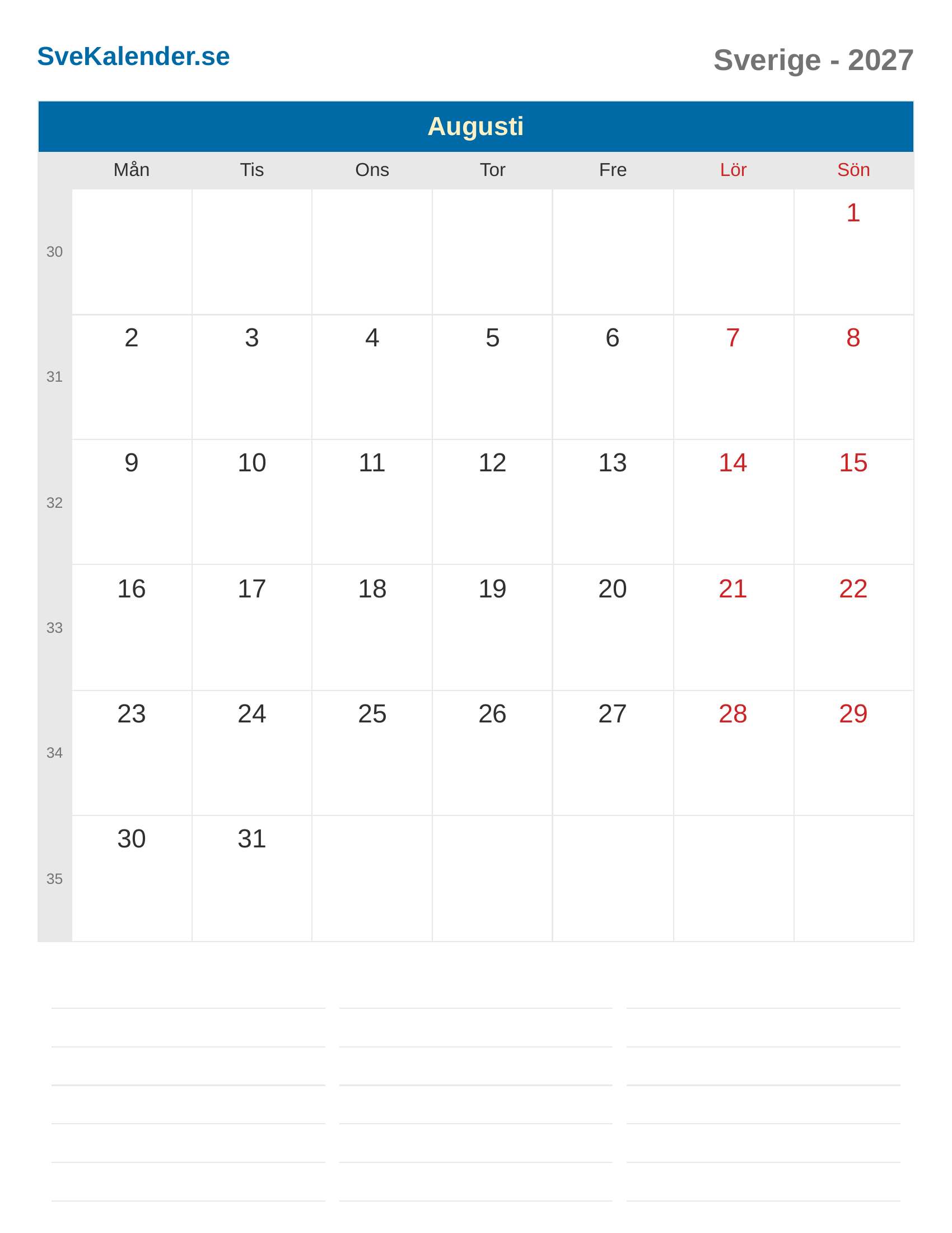 Kalender 2027 Sverige - Augusti