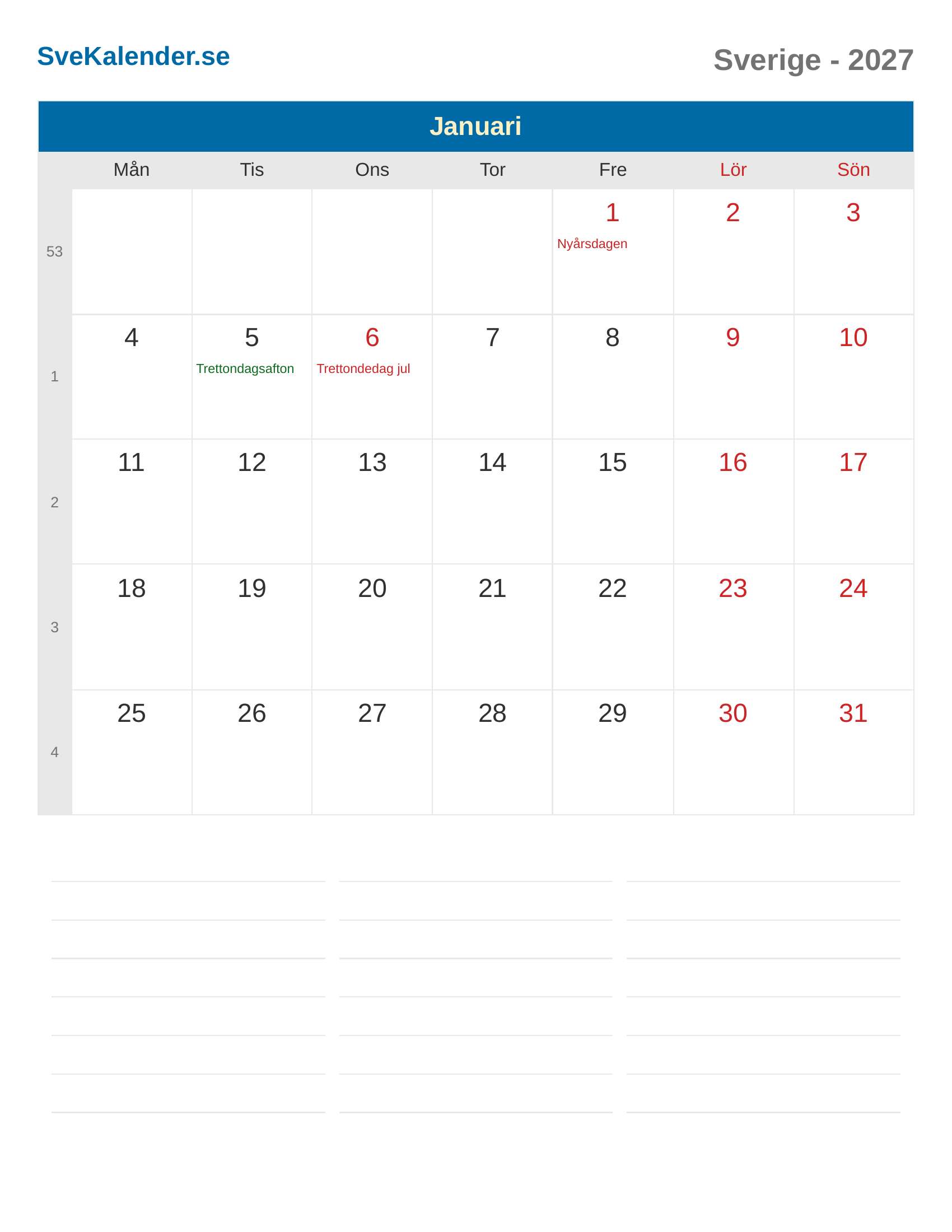Kalender 2027 Sverige - Januari