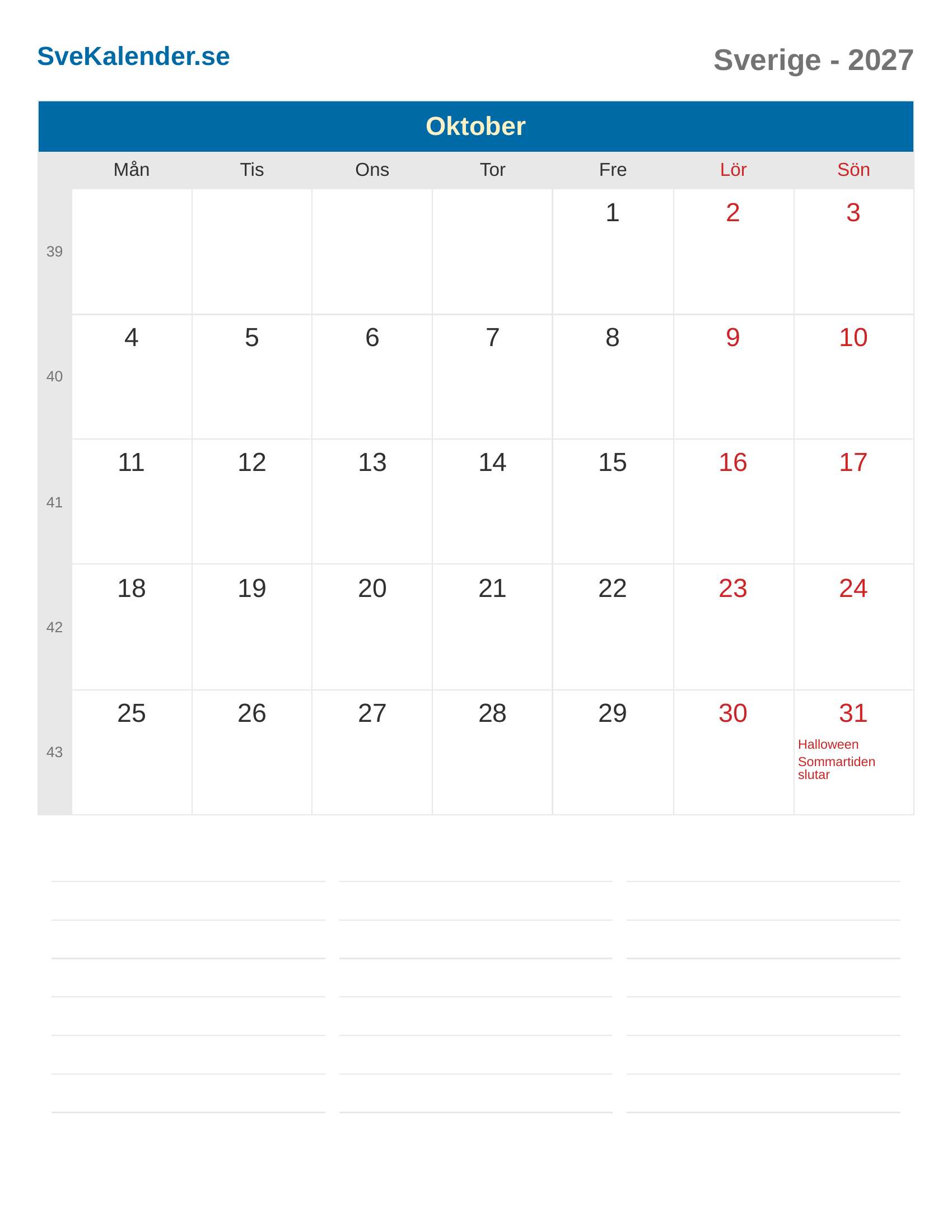 Kalender 2027 Sverige - Oktober